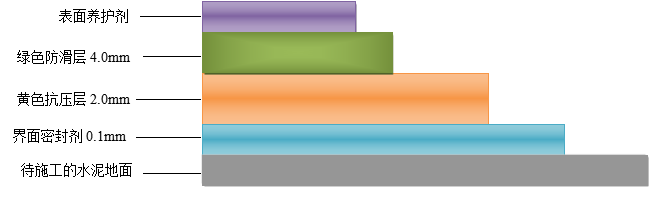 5.4施工方法:將防滑層材料根據(jù)要求配比、充分?jǐn)嚢韬?用鋸齒鏝刀均勻、平整、密實(shí)的攤鋪在抗壓層上,然后再噴涂一遍,形成約4㎜厚表面粗糙的彩色條形止滑帶。